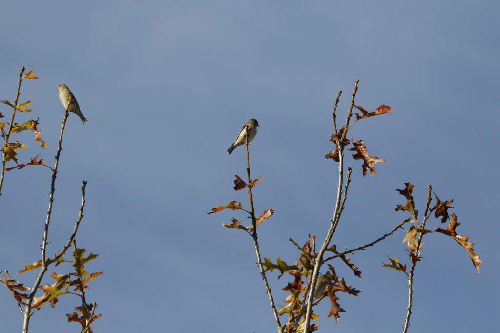 I saw these small birds on my walk today (1/1/2021).I initially assumed they were Lesser Goldfinches, and since I had many photos of earlier ones  I didn’t really try to get images from other angles. Now as I look at the photos, and check Merlin Bird ID and Sibley I wonder if they could be American Goldfinches instead (perhaps “non-breeding” males or “immature”). Image 0214 shows the backside of one of them with wing details (close to an Anna’s Hummingbird).